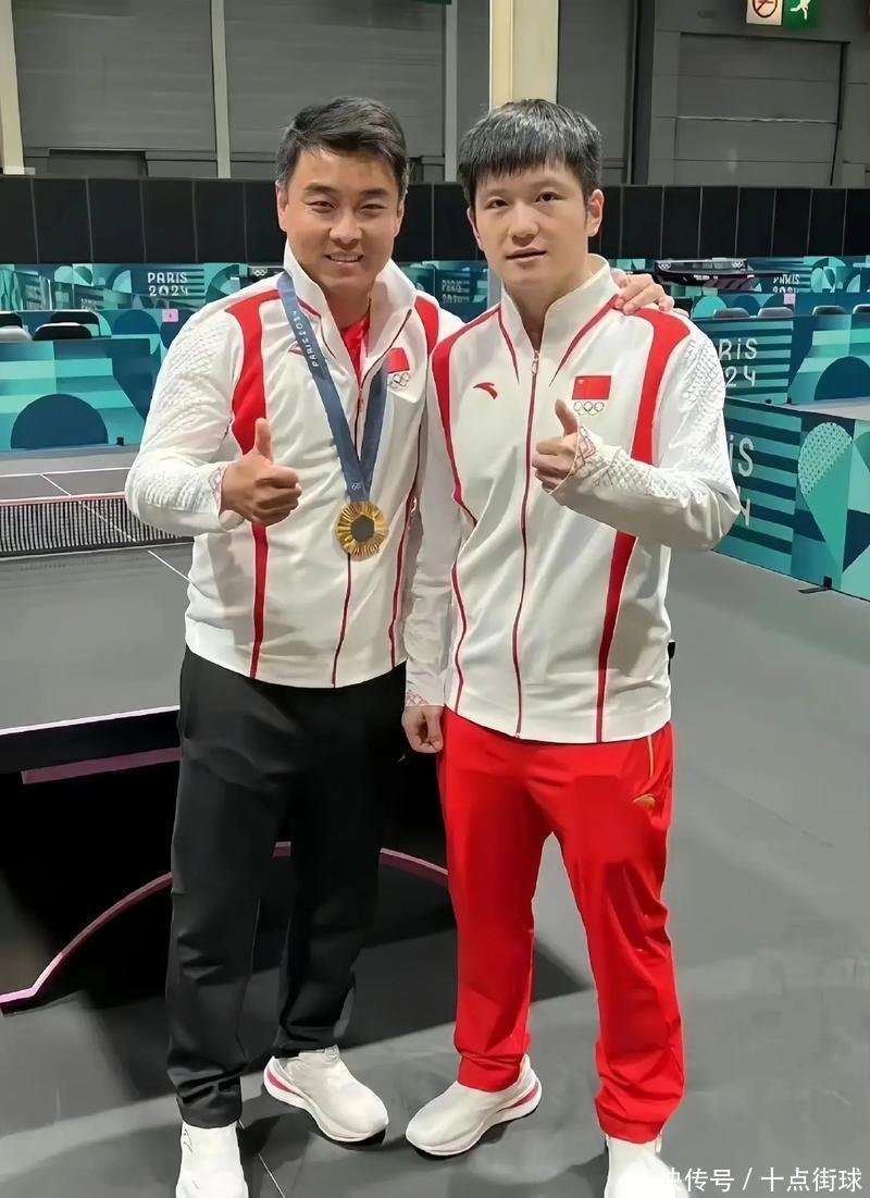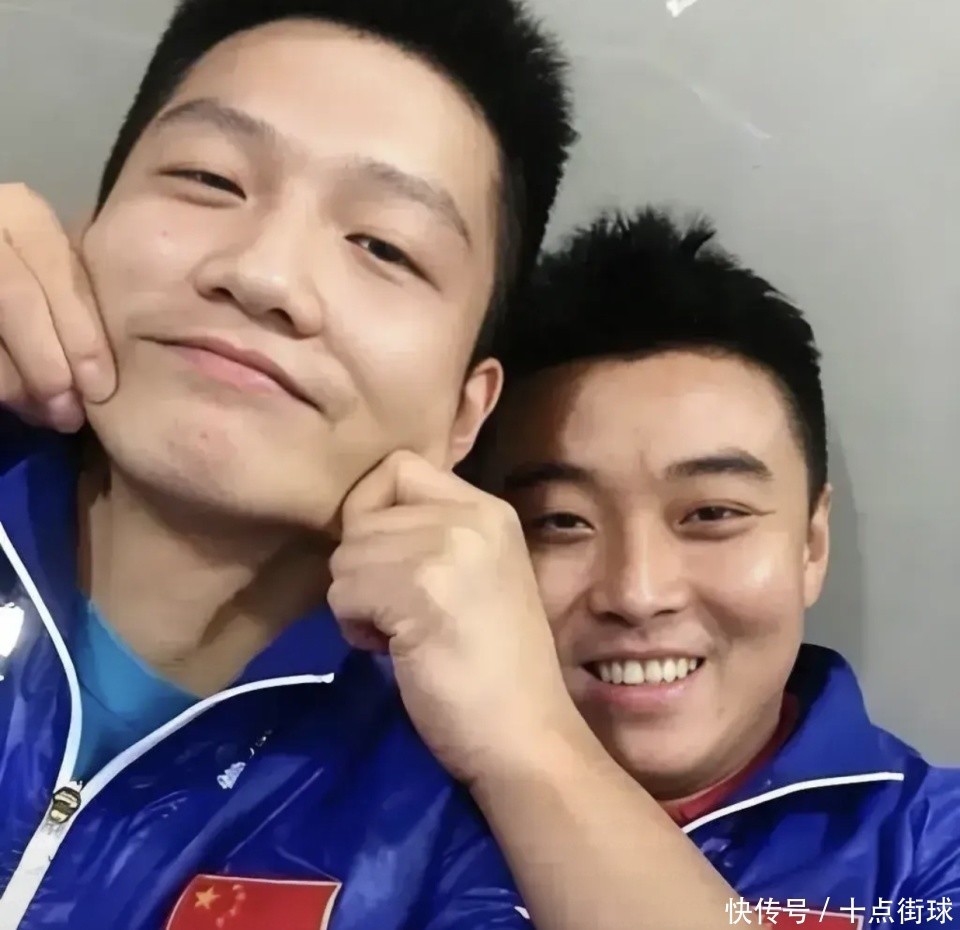 王皓与樊振东的关系早已超越了简单的师徒范畴,2009年全运会前,刚上八一队一年的樊振东担任陪练,第一次见到已是世界冠军的王皓,王皓对这位胖乎乎的小伙子说的第一句话是:“多练练体能吧!”当时谁能想到,这句简短的提醒开启了两人十余年的缘分,2014年,王皓在宣布退役时,坐在他身旁的樊振东一脸青涩