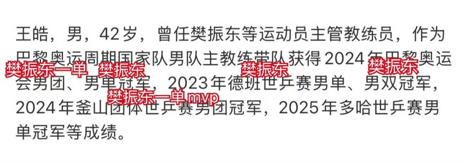 这份官方履历在网络上激起了不小波澜,有网友直白地评论道:“没有樊振东,王皓的履历只剩下:男,42岁。”这一调侃迅速传播,触动了公众对体育教练评价体系的敏感神经,网友的逻辑清晰而锐利:巴黎奥运会男单冠军是樊振东,男团金牌也是樊振东作为第一单打扛下来的,德班世乒赛男单冠军是樊振东,男双冠军是樊振东和王楚钦,釜山团体世乒赛,樊振东是一单兼MVP;除了多哈世乒赛男单冠军是王楚钦之外,这份履历如同一个镜像,映照出的几乎全是樊振东的辉煌
