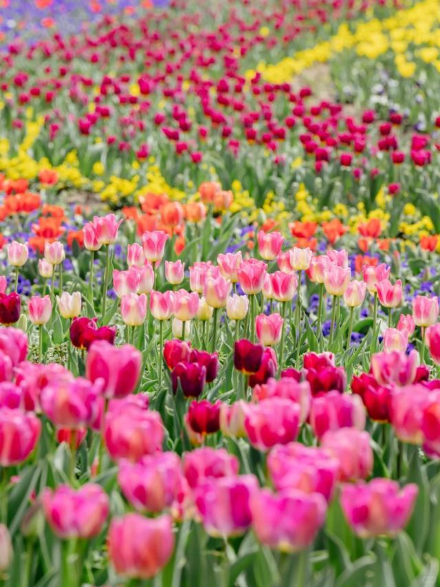 成片的郁金香红如烈焰、粉似云霞、白若飞雪,沿着起伏的坡地与蜿蜒的水岸铺展,宛如大自然打翻了调色盘。漫步其中,步步皆是景,随手一拍,就是一张治愈系大片。