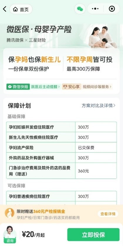 (腾讯微保专为孕期妈妈和宝宝定制的“母婴孕产险”)