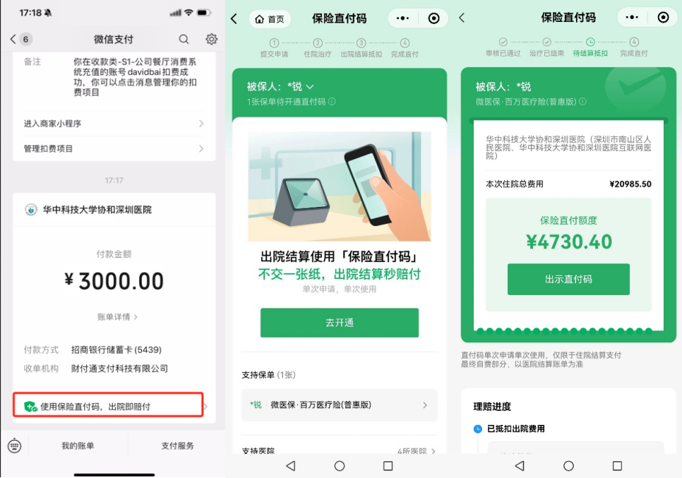 (图片分别是:微信支付入口、保险直付码页面、理赔金额展示页面)
