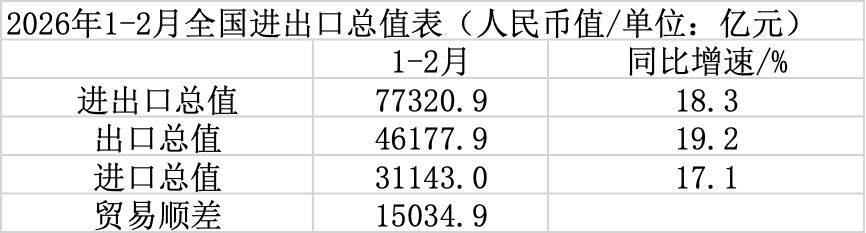 以人民币计,2026年1-2月,中国进出口总值7.73万亿元,同比增长18.3%。其中,出口4.62万亿元,增长19.2%;进口3.11万亿元,增长17.1%;贸易顺差1.50万亿元。