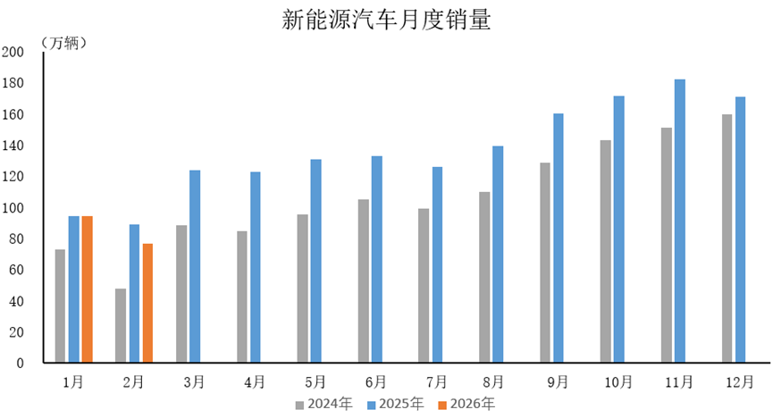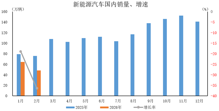 2026年2月,新能源汽车国内销量48.3万辆,环比下降24.9%,同比下降36.4%。1-2月,新能源汽车国内销量112.6万辆,同比下降27.5%。