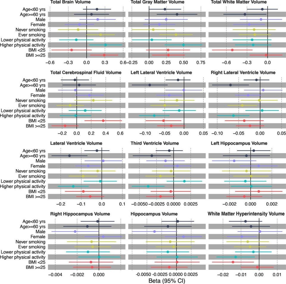 不同食物的影响:进一步分析发现,浆果的摄入与脑室容积增长减缓有关;禽肉摄入则与灰质萎缩减缓及脑室增长减慢有关。相反,甜食和油炸食品的摄入被发现与更快的脑室扩大或海马体萎缩有关。