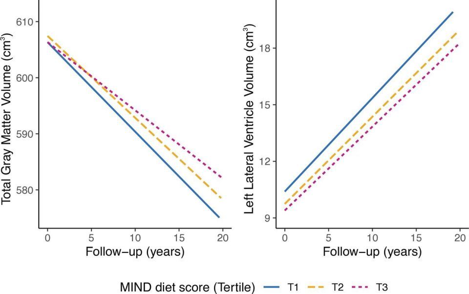 研究结果显示,更高的MIND饮食依从性与更慢的大脑结构萎缩速度密切相关