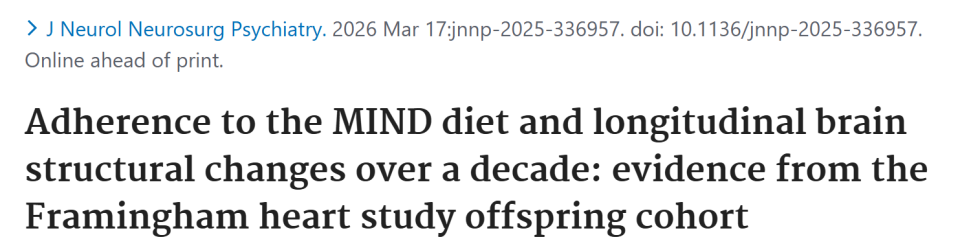 注:本文基于原文:Chen H配资炒股给股票, et al. Adherence to the MIND diet and longitudinal brain structural changes over a decade: evidence from the Framingham heart study offspring cohort. J Neurol Neurosurg Psychiatry. 2026.